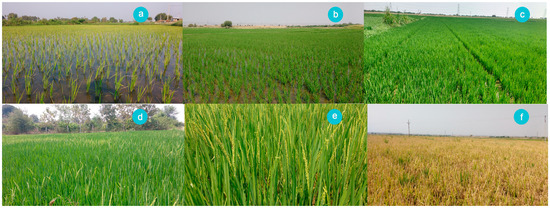 Rice crop at various growth phases: (a) seedling; (b) tillering; (c) elongation; (d) heading; (e) flowering; (f) maturity.