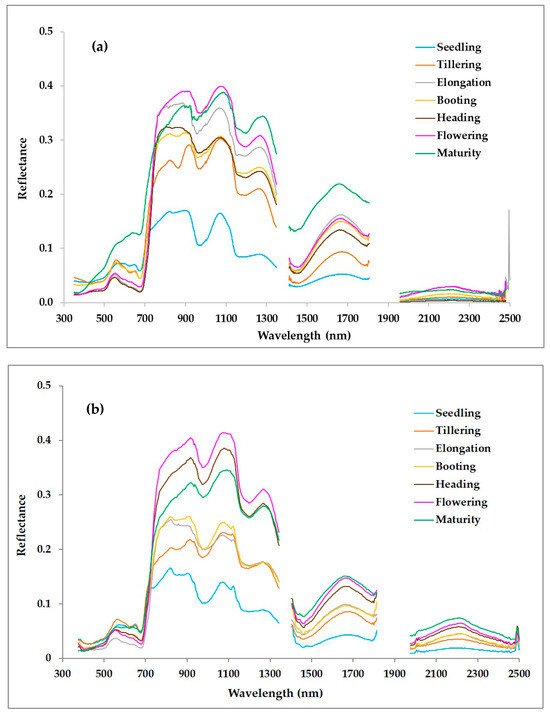 Hyperspectral signatures for different crop growth stages of rice recorded using (a) ground based measurements and (b) AVIRIS-NG.