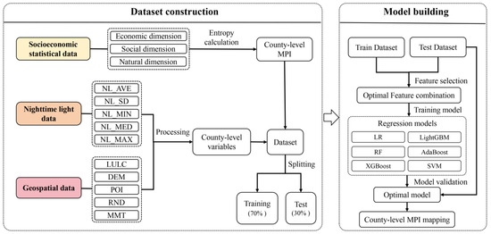 In this study, we computed the MPI using county-level statistical data from three dimensions (social, economic, and environmental) in Fujian province. Simultaneously, we extracted county-level independent variables from NL and geospatial data. Subsequently, we partitioned the datasets into a training dataset (70%) and a test dataset (30%). Then, we modeled the relationship between MPI and independent variables using both linear regression and machine learning models to identify the most appropriate model. Finally, we applied this optimal model to map the county-level MPI. Figure 2 provides an overview of the workflow.
