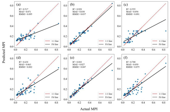 Scatter diagrams between the actual multidimensional poverty index (MPI) and the predicted MPI at the county level for various models: (a) linear regression (LR); (b) random forest (RF); (c) light gradient boosting machine (LightGBM); (d) support vector machine (SVM); (e) extreme gradient boosting (XGBoost); (f) adaptive boosting (AdaBoost).