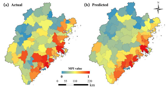 Map of the actual (a) and predicted (b) multidimensional poverty index (MPI) at the county level for Fujian province in 2022. The predicted MPI was generated from the optimal model (random forest).