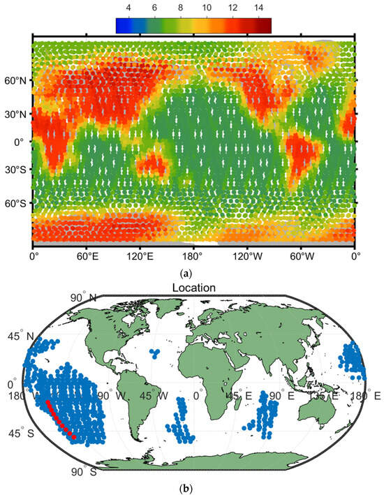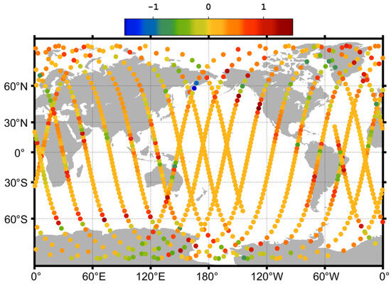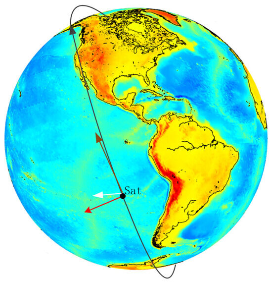 Although the spherical approximation of the Earth model is simple and fast to implement in the computation, it can introduce some significant errors in geolocations and local incidence angles [9]. The antenna temperature Ta bias between the Earth ellipsoid model and the simplified spherical model in the cold-sky observation of the radiometer system is simulated in Figure 9. The differences are very apparent from the comparison of these two Earth models, especially when the spacecraft flies across the coastline, which is relatively larger than 1 K. For example, significant errors can happen at some land–ocean crossing geolocations, such as the ocean area at 60 degrees south latitude near the South Pole, the Bering Strait, the ocean near the Amazon forest, and so on. Therefore, the simplified spherical model of Earth is not suitable for antenna spillover or sidelobe calibration mode design, which can lead to significant errors, although the computation is efficient. As for cold-sky calibration design over an open-ocean area, the simplified spherical model of Earth can be used to improve efficiency.