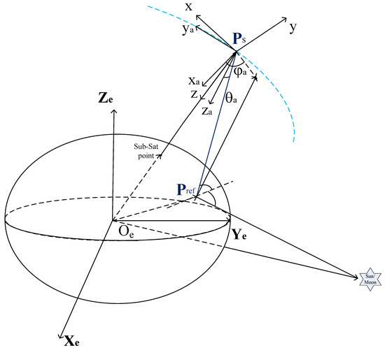 The estimation of the angle of the sun or moon with respect to the array boresight is critical for calibration. The total antenna temperature and the observed standard deviation error of the celestial sky measurements are affected by the sun’s position in SMOS [5]. The brightness temperature drifts, although the receiver temperature does not change much. Therefore, the influence of the sun/moon on the synthetic aperture radiometer is one of the factors that must be considered in external calibration. In a given epoch, the position of the spacecraft in an Earth-fixed coordinate system is Ps (x, y, z), and the velocity is Vs (Vx, Vy, Vz), as shown in Figure 3. The + Z axis of the antenna of the radiometer points to the ground, and the +X axis is oriented towards the track direction when the satellite is flying forward. According to the sun/moon vectors SM(x, y, z), the angle θa = f(Poz, SM) can be obtained, that is, the angle between the sun/moon vector and + Z axis [6]. Poz is the +Zs axis direction of the spacecraft body frame in the Earth-fixed coordinate system, and it can be obtained by the attitude variations (roll, pitch, or yaw) from spacecraft data. The SM vector originates from where Poz originates. The angle between the sun/moon vector and the + X axis of the antenna coordinate system is φa = f(Pox, Projxoy_plane(SM)) in the spherical coordinate system, where Projxoy_plane(·) is the vector projection function to the XOY plane and . The sun/moon reflection location on the ground is described in the following equation, assuming that Earth’s semi-major axis is ae, the semi-minor axis is be, and the position of the reflection point Pref can be written in the form of the following equations. This situation calls for a more realistic elliptical model for Earth.