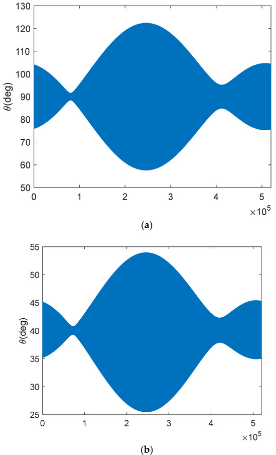 - The antenna’s thermal stability should also be considered in the strategy. According to the emulated relationship between antenna thermal deformation and antenna pattern changes at the pre-launch phase, the appropriate β value for cold-sky observation is determined by minimizing the antenna pattern variation. If the β angle meets the requirements, the corresponding time is suitable for cold-sky calibration. Once the satellite orbit is determined, the antenna temperature field distribution can be calculated from the orbital beta angle (β angle) and the antenna thermal parameters [17]. The antenna’s thermal parameters are known by the material properties, so the temperature field distribution is only determined by the beta angle, that is, FA(x,y) = f(β). The antenna thermal deformation can also be determined by f(β). Then, according to the acceptable range of antenna pattern error, the acceptable β range of external calibration can be determined. A look-up table can be obtained before the satellite is launched by simulation. The red dot area in Figure 6 should be avoided.