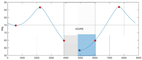 In order to improve the fidelity of the simulation for cold-sky calibration design, a parameter that can depict the effect of the space environment, especially the thermal conditions, should be introduced into the procedure of the cold-sky calibration strategy. The beta angle (β), which is the angle between the solar vector and the orbital plane, is usually used to perform thermal analysis and design. Thereby, it can be used as the parameter that depicts the thermal environment variation around the orbit. The worst thermal environments happen at higher beta angles when the sun is more fully incident on the feed horn, and the mutation of the thermal environment happens at the red dot area, as shown in Figure 6. The thermal analysis results of the radiometer antenna can be obtained from the material properties of the antenna and the thermal model, which is traditionally modeled by the beta angle [16]. The spaceborne radiometer antenna’s gain is affected by the variation in the physical temperature, whose effect on cold-sky calibration can be very large. When the temperatures of the antennas change periodically as the satellite flies, geometrical errors of the antennas are generated periodically. The red dots in Figure 6 show both the inflection point of the beta angle curve and the moment when the eclipse seasons begin and end, where the temperature changes extensively, and the worst-case thermal stability [16]. By being combined with the thermal expansion coefficient of the antenna material and antenna temperatures, the antenna deformation can be quantitatively established, and the relationship between the beta angle and the gain variation of the antenna can be modeled as a look-up table before launch. In-orbit antenna pattern verification is based on the flat target response of the cold-sky scene during external observation [1]. The antenna pattern errors due to thermal distortion will reduce the effect of flat target transformations. Therefore, the space environment of the satellite operating on should be paid attention to when choosing opportunities for cold-sky calibration. The beta angle can be used as a parameter depicting the space environment’s impact.