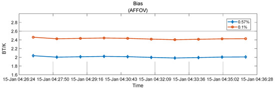 The spacecraft is usually kept inverted into the sky for a few minutes during cold-sky calibration. For example, the maneuvers before and after the external calibration measurement period each take about 20 min on SMOS [1]. The duration of the external calibration mode is less than 10 min; the actual measurements should, therefore, take less than 60 min. This duration value is further restricted to the pointing stability holding time, as shown in [1]. Assuming that the cold-sky observation time is 10 min, the single-antenna brightness temperature observation results are given in Figure 10a under the above three selection conditions. The brightness temperature stability is 0.0096 K during the period, and the area is shown by the red dot in Figure 8b. During the above simulated time period, the cold-sky observation time that meets the brightness temperature stability of the antenna is less than 0.01 K/10 min, and the other two criteria at the same time can achieve a maximum duration of 13 min in the open ocean of the Pacific Ocean, where the latitude is between 58 degrees and 15 degrees south and the longitude is between 138 degrees and 152 degrees west. In addition, the antenna brightness temperature stability is 0.0084 K.