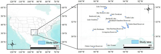 As shown in Figure 1, our study lakes are mainly located in East Texas with abundant reservoirs and massive open-access hydrological data. We selected 14 regulated reservoirs monitored by satellite altimetric data as our study lakes (Table A1). The study lakes are of various sizes (average area: 12–678 km2, average volume: 0.06–4.90 km3). Among the study lakes, there are five large lakes (lake area > 100 km2 and lake volume > 1 km3) and nine small lakes.