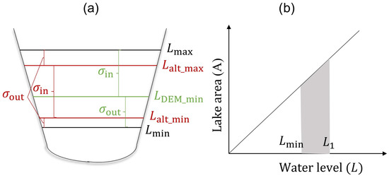 Assuming the lake shape is regular as in Figure 2a, the lake area (A) and lake water level (L) are linearly correlated and the hypsometric curve is shown in Equation (1) with a first-order polynomial [12,17,18]. Gauge records provide real water level range ( to ), while only part of the water level was observed by remote-sensing data. DEM provides elevation above lake surface elevation (, and satellite altimetric data provide periodic observations ranging from to . When satellite water level is , variable lake volume () above can be estimated by integrating lake area against from to [11,13,17] (Figure 2b and Equation (2)).