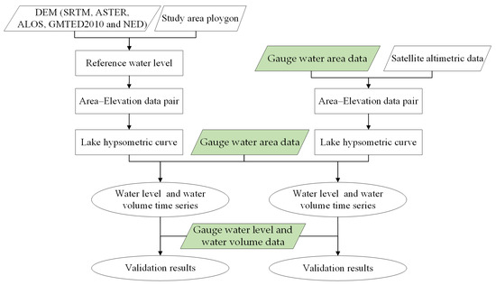 Workflow diagram of lake volume estimation by DEMs and satellite altimetric data.