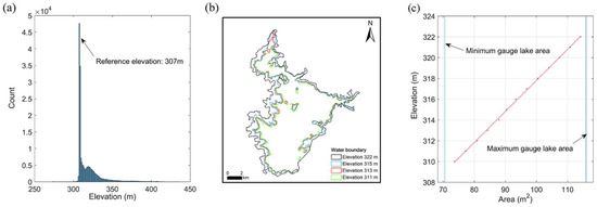 - Finally, establishing the lake hypsometric curve. The data pairs obtained in the last step describe the potential relationship between lake area and water level. From gauge lake area records, the area variation range is known. Assuming the area ranges from to , the corresponding elevation–area data pairs within the range are extracted. If there are more than five data pairs, they are used to establish the lake hypsometric curve. Otherwise, the elevation–area data pairs within the range of to are used. As shown in Figure 4c, data pairs within the gauge lake area range are kept, and the elevation and lake area have a good linear correlation relationship.