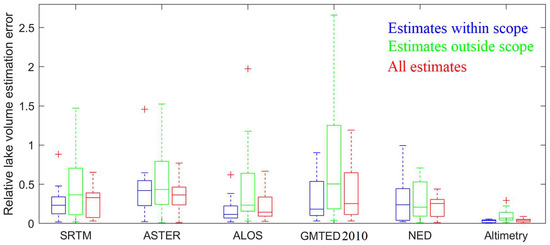 Distribution of relative lake volume estimation error of DEMs and altimetric data. Note that blue, green, and red indicate lake volume estimates within remotely sensed elevation scope, outside remotely sensed elevation scope, and all estimates, respectively. On each box, the central mark indicates the median, and the bottom and top edges of the box indicate the 25th and 75th percentiles, respectively. Outliers are plotted individually using the ‘+’ marker symbol.