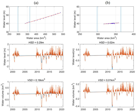 Water level and volume estimation results of NED (a) and satellite altimetric data (b) for Livingston Reservoir. Each example includes the following: (1) the elevation−area relationship; (2) estimated (orange) and gauge (blue) water level time series; and (3) estimated (orange) and gauge (blue) water volume time series. Water level and volume estimation error HSD and VSD are marked.