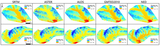 Comparison of five DEMs (SRTM, ASTER, ALOS, GMTED2010, and NED) for small lake Bardwell Lake (the first row) and large lake Ray Roberts Lake (the second row).