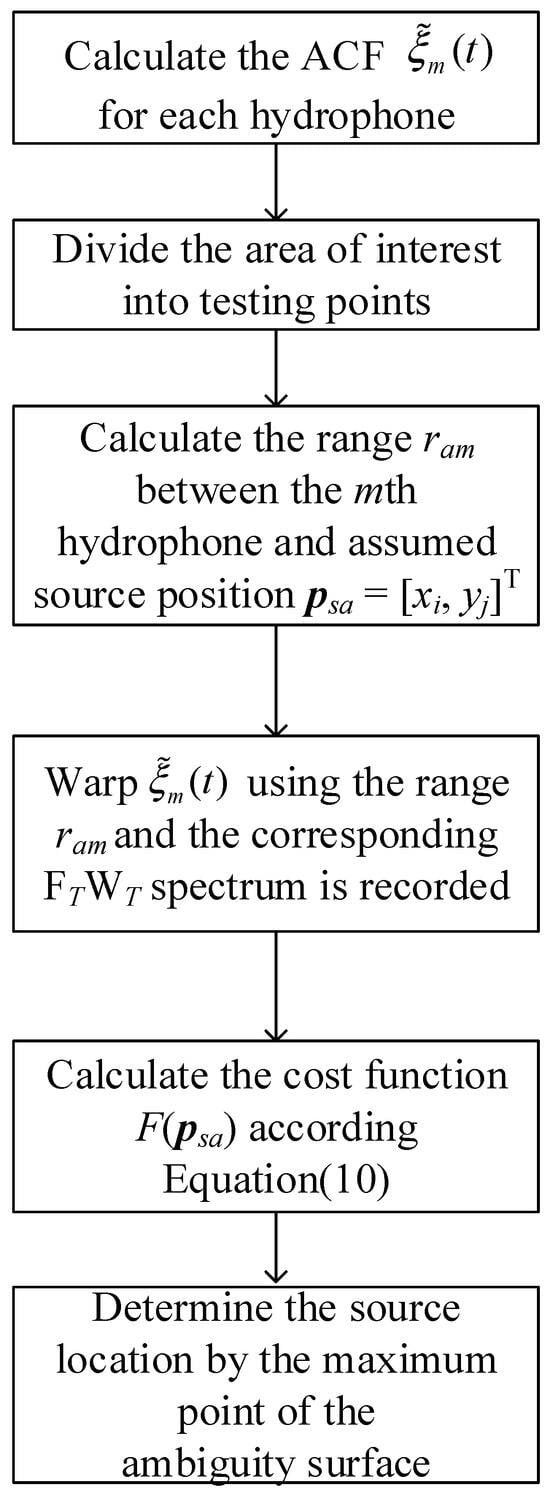 where psa is the assumed source location, denotes the FTWT spectrum for the mth hydrophone that can be calculated by applying Fourier/wavelet transform to the corresponding warping output , and ||·|| is the Euclidean norm.