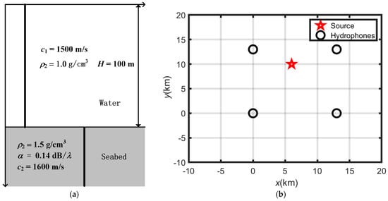 This section conducts numerical simulations in shallow water to validate the proposed method. A Pekeris waveguide, illustrated in Figure 3a, is considered in the simulation. The water depth is H = 100 m with a constant sound speed c = 1500 m/s and a constant density ρ1 = 1.0 g/cm3. The seabed is modeled as a soft half space. The density, sound speed, and attenuation coefficient are ρ2 = 1.0 g/cm3, c2 = 1600 m/s, α = 0.14 dB/λ, respectively.