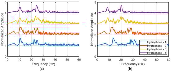 Figure 4 presents the normalized FTWT spectra from the distributed hydrophones for the scenario described in Figure 3b. Figure 4a,b correspond to the cases where the source location is correctly and incorrectly assumed, respectively. As can be seen, if the source location is correctly assumed (i.e., Figure 4a), the FTWT spectra for the different hydrophones shows the same shape. Otherwise, the consistency among the FTWT spectra will be disrupted as shown in Figure 4b. The results in Figure 4 convincingly demonstrate the feasibility of the proposed method.