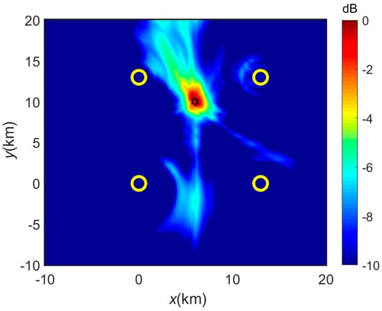 Divide the area of interest (i.e., −10 km < x < 20 km, −10 km < y < 20 km) into grids with a step of 0.4 km and calculate the ambiguity surface using the algorithm shown in Figure 2. The sound speed used in the warping transform is ca = 1500 m/s. The obtained localization ambiguity surface is shown in Figure 5, wherein the cost function is normalized in decibels with a dynamic range of 10 dB. In Figure 5, the black asterisk donates the true source location, and the yellow circles represent the locations of the hydrophones. As can be seen, the ambiguity surface clearly peaks at the location of the source, demonstrating the effectiveness of the proposed method. In this simulation example, the localization result is [6.17, 10]T km with a localization error of 0.17 km. It is worth mentioning that the basic idea of the method is to mutually match the warped ACF obtained by distributed hydrophones, and the warping processing has nothing to do with the source depth. In other words, the method proposed in this paper can estimate the two-dimensional position of the sound source in the xoy plane when the source depth is unknown.