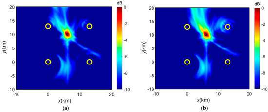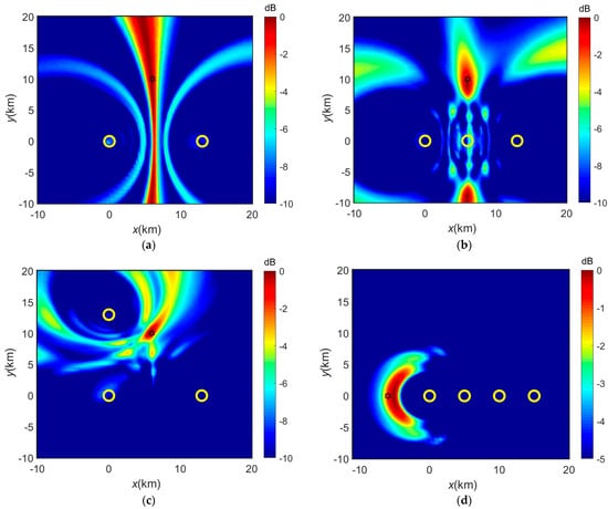 Therefore, if there exists more than one point that satisfies Equation (13) in the area of interest, the ambiguity surface will exhibit more than one peak, and the localization result will become ambiguous. For example, if only two hydrophones are used, the points satisfying Equation (13) form a circle characterized by a radius of R = QL/|1 − Q2|, where Q is the distance ratio between the source and the two hydrophones, and L is the distance between these two hydrophones. Thus, the proposed method becomes invalid when only two hydrophones are used, as shown in Figure 7a. A fuzzy band emerges in the localization ambiguity surface and the true source location cannot be identified.