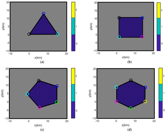 Define the area enclosed by the hydrophones as the detection area for the nonlinear distribution. The localization ambiguity of the proposed method can be numerically analyzed based on Equation (13). Specifically, one can count the number of the points (except ps) that satisfy Equation (13) in the detection area. The simulation results under different numbers of the hydrophones are shown in Figure 8, wherein the hydrophones are deployed through a regular M polygon. As seen with a M-polygon distribution, the proposed method can provide an unambiguous localization in the detection area.