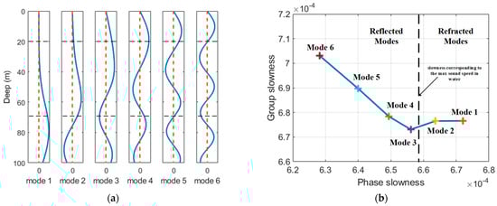 Normal mode theory could be used to account for these simulation results. The modes distribution at 125 Hz for the waveguide in Figure 9 is depicted in Figure 11, which involves (a) the modes depth function and (b) the relationship between phase and group slowness. As can be seen in Figure 11, when both the source and hydrophones are deployed above the thermocline layer, or the source is above (or below) the thermocline layer while the hydrophones are below (or above) this layer, the received field is predominantly influenced by the higher order modes (i.e., n ≥ 3). When both the source and hydrophones are below the thermocline layer, the lower order (i.e., 1st and 2nd) modes dominate the field. The higher order modes correspond to the reflected modes while the lower order modes are the refracted modes. Following the conclusion in Ref. [26], the time warping function shown in Equation (7) is exclusively associated with the reflected modes, rendering it ineffective for the refracted modes. Therefore, the proposed method works well in the case that the reflected modes dominate the received field (i.e., the source and/or hydrophones are above the thermocline layer) and becomes invalid if the received field is dominated by the refracted modes (i.e., both the source and hydrophones are below the thermocline layer). As a result, it is recommended to deploy the hydrophones above the thermocline layer in the thermocline waveguide to improve the applicability of the proposed method.