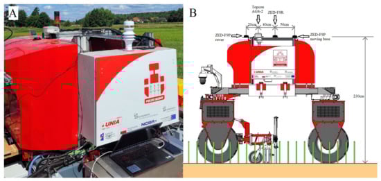 The machine was designed in line with current trends among robots performing agro-technical operations in the field. It is a device that uses a commercial satellite receiver, developed for tractor guidance, to move independently along the technological path, but any system with the appropriate communication protocol can be connected for this purpose. However, for the purpose of the experiments, the vehicle was driven manually from a remote control operated by an operator. The experiment was carried out in July under field conditions on an agricultural field of approximately 0.6 hectares (Figure 3A) with a maize plantation in the early stages of growth at the 3–4-leaf level. The experiment was conducted on flat terrain that had small local depressions and was moderately wet, without causing excessive machine perching or pollination. The experiment was implemented in a location close to the Poznań metropolitan area (Figure 3B), which benefits from good coverage and quality of the ASG-Eupos and GSM networks signal.