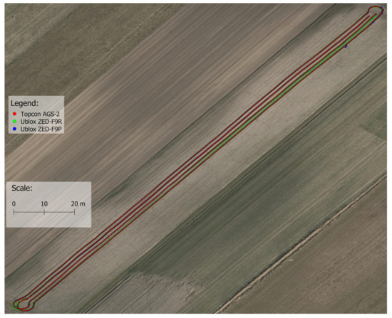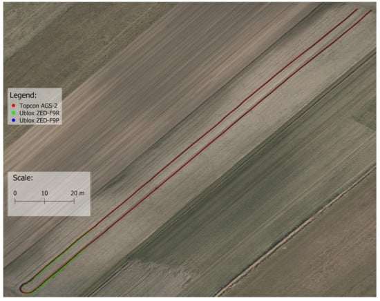 As mentioned above, two measurements were carried out and analysed separately. The first measurement consisted of a shorter pass with one turn (Figure 5). The figure shows the overall trajectory of the first pass superimposed on the field map from the three GNSS receivers. The resulting trajectories were compared with the reference trajectory using the evo tool, and the measurement deviation results for the individual receivers are summarised in Table 1.