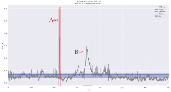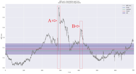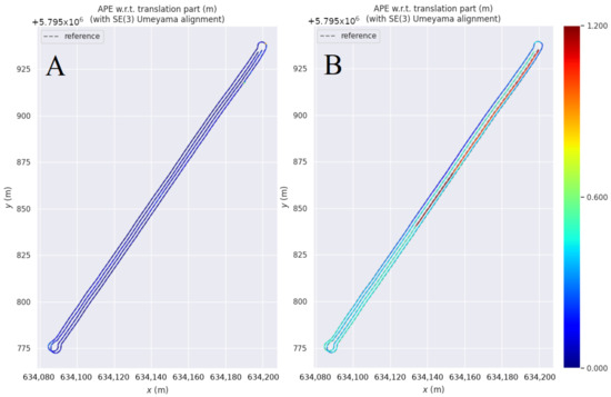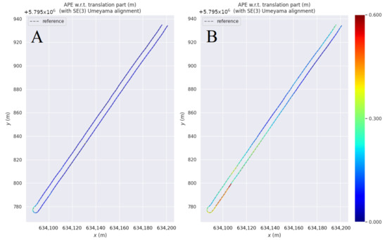 and then obtain the ATE value for the whole trajectory from the RMSE of (1) for all GNSS poses. It is important to note that, to ensure accurate ATE calculations, the trajectories must be aligned beforehand by identifying a transformation that minimises the distance between the two rigid sets of points representing these trajectories (1). In the first step of processing the input trajectories, pairs are created between the compared GNSS poses based on their time stamps. Then, based on the related points, the considered trajectories are aligned using the Umeyama algorithm [80]. The next step is to calculate the differences between each pair of points, and the results of the position errors are presented as mean, median, and standard deviation. Finally, graphs are generated showing the trajectories under consideration, together with a display of the position errors at each section of the route. Both toolkits used in the presented experiments are equipped with procedures for calculating the absolute trajectory error according to the definition given by (1); however, in evo, this metric is called absolute pose error (APE). To remain consistent with the plots generated by evo, we will use the APE acronym throughout this paper.