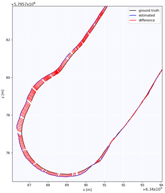 Figure 9 presents a detailed view of the analysed trajectory during the turning procedure. This segment was captured between 320 and 360 s of measurement, which is marked by the letter B in Figure 7. In the previously presented characteristic in Figure 7, there is a noticeable increase in the position error, which reached a maximum of 0.3 m and then started to return to values similar to the estimated position’s standard deviation. By referring to Figure 9, it becomes apparent that the error of the measured trajectory intensified as the machine initiated the turning stage. As the machine passed through the curve, the error gradually increased. Only at the end of the turnaround, when the machine began to drive on a relatively straight line again, did the position error slowly decrease. This effect observed in this measurement setup may be due to the fact that the data are only acquired from the GNSS receiver, without being combined with data from the machine’s steering system or inertial unit. Maintaining the consistency of measurement between consecutive points along the designated course results in an insufficiently dynamic response of the measurement set.