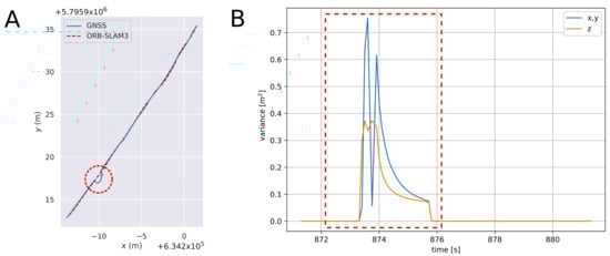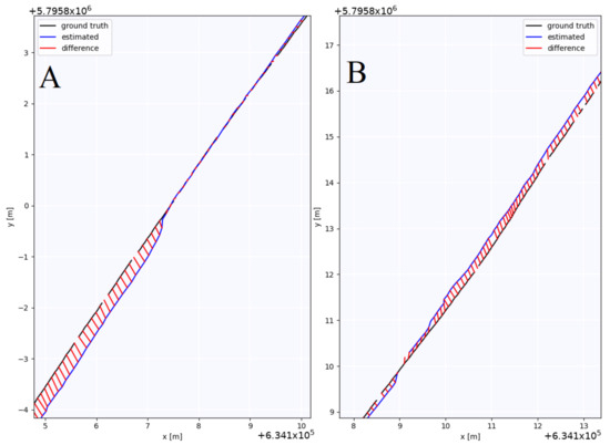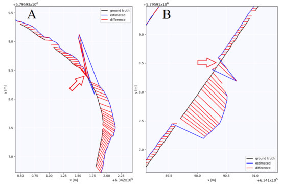Figure 15 shows segments of the estimated trajectories with an instantaneous significant measurement disturbance. In the figures, corresponding measurement points of the anticipated trajectory and ground truth are indicated. A marked, sudden rise in absolute position error can be observed in Figure 15A,B at the points marked with arrows. This was caused by a brief data loss from the moving base module, leading to a drop in the estimated heading to 0.