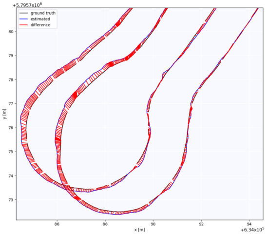 To assess the precision of the reconstructed trajectories, the absolute trajectory error (ATE) method is employed. This technique, along with its associated error metric, was originally presented in [79] and has since become widely adopted in robotics research. The ATE value is determined as the Euclidean distance between the corresponding points of the estimated trajectory and the ground truth trajectory. Consequently, the ATE metrics provide insights into the deviation of the estimated pose along the trajectory from the reference pose. For the entire trajectory, the root mean squared error (RMSE) of the ATE metrics is computed. Assuming that two trajectories are given—the ground truth one , and the estimated one , with the same number of n GNSS receiver poses—and that and are given as 4×4 homogeneous matrices, we can compute the ATE metrics for the i-th frame: