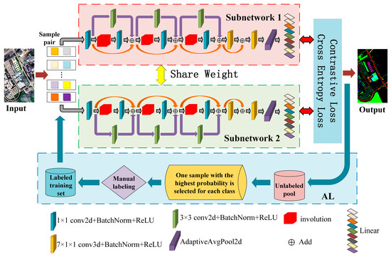 - An active learning-based multipath residual involution Siamese network for few-shot HSI classification, AL-MRIS, is proposed. In the AL-MRIS method, the multipath residual involution (MRIN) module can comprehensively consider the local features, dynamic features and global features of HSIs. Moreover, to address the sample scarcity problem, the AL strategy is integrated into the Siamese network to make the training samples more representative to improve the classification performance.
