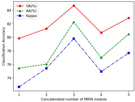 - The multipath residual involution (MRIN) module is proposed. The MRIN module captures fine-grained features via an involution operation and effectively aggregates the contextual semantic information of the HSI through dynamic weights. Moreover, the MRIN module comprehensively considers local features, dynamic features and global features through multipath residual connections, which improves the representation ability of HSIs.