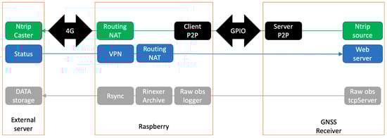 We used a low-cost single-board Raspberry Pi computer (https://www.raspberrypi.com/ (accessed on 10 January 2024)) to control the Septentrio Mosaic-X5, to manage the data flow and to handle data transmission (Figure 2). The Raspberry Pi was equipped with a 16 GB SD flash memory split into two logical partitions. The first partition hosts the Linux Raspbian operating system and uses an Overlay File System that prevents corrupting the integrity of the SD memory. It also ensures that the system always reboots in the same user-defined configuration. The second partition is dedicated to the data management.