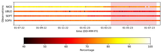 Satellite tracking evaluation regarding the number of daily GNSS observations above the horizon retrieved by the SEPT, UBLO, SOPH, and NICE stations. The light pink vertical stripe depicts the time interval where, for most days, GNSS observations of the UBLO station decrease by ∼20%.