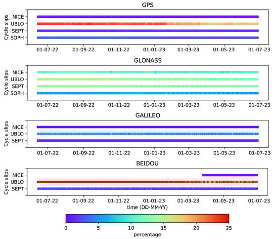 Daily cycle slip values estimated at the SEPT, UBLO, and SOPH sites for the GPS and GLONASS constellations (SEPT and UBLO shared antenna is 5 m apart from SOPH antenna, Table 1). In order to assess the quality of the low-cost stations for the Galileo and BeiDou constellations, we have also included the NICE station, located 20 km away, in the comparison. BeiDou GNSS observations on the NICE site started after the last receiver replacement in March 2023.