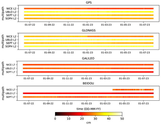 Aside from the results of cycle slips described above, Figure 5 depicts an example of the multipath error estimation for the SEPT, UBLO, SOPH, and NICE stations on the L2 frequency (GPS, GLONASS) and for NICE, SEPT, and UBLO on L7 (Galileo, BeiDou). Since the environment surrounding the antenna of the NICE station is slightly different from the others, we have included it in the comparison to have first-order information in the statistics for the Galileo and BeiDou constellations. The comparison, therefore, shows lower multipath values at the SEPT station (∼30 cm for GPS-GLONASS and ∼2 cm for Galileo) relative to the UBLO station (40–45 cm for GPS-GLONASS and ∼26 cm for Galileo) for all constellations, suggesting an excellent algorithm of multipath mitigation that might also result in lower noise levels at the positioning solution. Surprisingly, multipath values at SEPT are also quite similar or even lower than values observed at the SOPH station, pointing out the excellent accuracy of the low-cost antenna as suggested in Krietemeyer et al. [] and Curone et al. [].