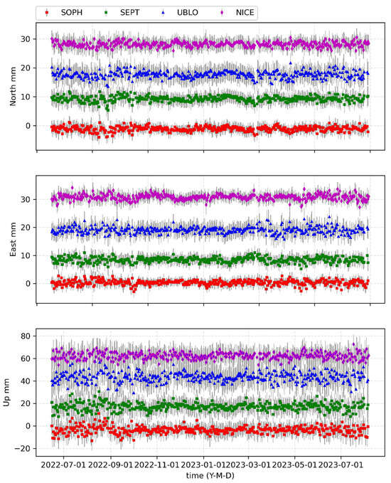 We assess the performance of our all-in-one low-cost GNSS station, hereafter referred to by code SEPT, against existing nearby or co-located equipment. Compared stations are: (1) the SimpleRTK2B electronic board (https://www.ardusimple.com/product/simplertk2b/ (accessed on 10 January 2024)), also manufactured by Ardusimple. Such a board integrates the Ublox’s ZED-F9P GNSS module ( https://www.u-blox.com/en/product/zed-f9p-module (accessed on 10 January 2024)) and does not track all available GNSS signals (Table 1). We used the same approach described above to control the SimpleRTK2 board and its data flow using a Raspberry PI card. The u-blox receiver is, hereafter, referred to as code UBLO. The Septentrio Mosaic-X5 and Ublox ZED-F9P GNSS receivers are both connected to an Ardusimple AS-ANT3BCAL antenna (https://www.ardusimple.com/product/calibrated-survey-gnss-quadband-antenna-ip67/ (accessed on 10 January 2024)) using a GNSS antenna splitter (https://www.instockwireless.com/gps-antenna-signal-splitter-gps220.htm (accessed on 10 January 2024) ). (2) Site SOPH, equipped with a Trimble NetR9 receiver and Ashtech Choke ring antenna, located a few meters away from the SEPT and UBLO sites. (3) Site NICE is located 20 km away from SEPT, UBLO and SOPH, equipped with a Trimble NetR9 receiver and Zephyr 2 antenna. SOPH and NICE are part of the National French GNSS Network (RENAG, http://renag.resif.fr/fr/ (accessed on 6 March 2024)) and hence continuously record GNSS data [] analyzed by numerous analysis centers (IGS, EUREF, NGL, Renag, etc.). They show typical long-term repeatabilities of 0.1 and 0.3 mm/yr over 22 years of observations, for the horizontal and vertical components, respectively [].