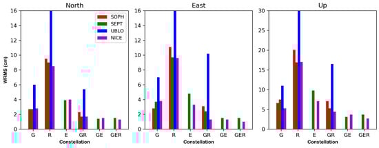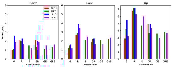 Repeatability (WRMS) computed from daily residual positions for the GNSS processing in the static mode. The x-axis depicts the GNSS solution according to the selected constellation. G: GPS, R: GLONASS, E: Galileo, GR: GPS-GLONASS, GE: GPS-Galileo, GRE: GPS-GLONASS-Galileo.