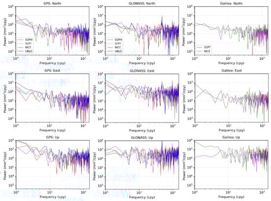 In addition to the repeatability, we also evaluated the noise property of the residual time series for the GPS, GLONASS, and Galileo solutions by computing the Power Spectral Density (PSD). The PSDs show a flat spectrum at high frequencies and a slope of roughly −1 at low frequencies for all sites (Figure 8), consistent with a white and flicker noise combination, as is observed in regional or global GNSS stations. We also notice that power is slightly higher at high frequencies for the UBLO station (∼0.2–0.5 mm2/cycles per year) relative to the other stations (GPS and GLONASS spectrums). Interestingly, we also notice that power magnitude, at the east component of all stations, for the GLONASS spectrum increases by above one decade (101 mm2/cycles per year) relative to the power in the GPS and Galileo at all frequencies, which is consistent with the substantial improvement of the GPS and Galileo products in the last years (orbit, clock parameter estimation, etc. [,]). Overall, noise magnitudes at our low-cost station (SEPT) are almost identical to the ones at the high-class geodetic stations.