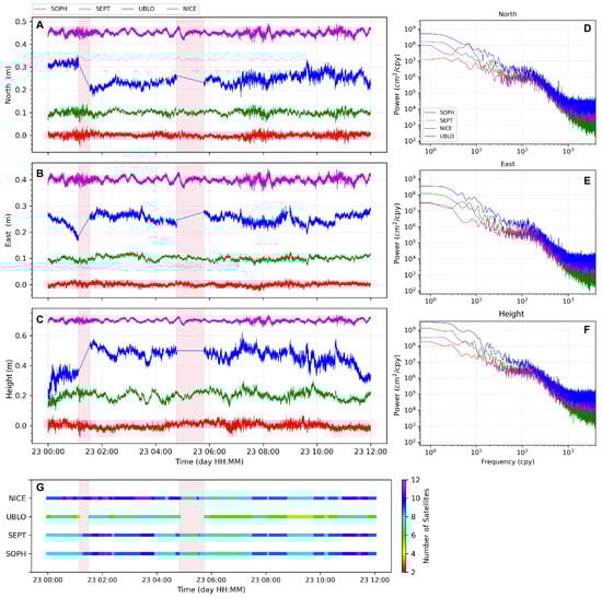 Kinematic displacement for the 1-s sampling rate at the NICE, SEPT, SOPH, and UBLO sites on 23 July 2023. (A–C) panels depict the kinematic displacements for the GPS constellation. Detrended traces have been shifted to avoid overlap. Light pink vertical stripes within the left panels indicate the displacement gaps at the UBLO site. (D–F) are the power spectral densities (PSD) estimated from the detrended kinematic displacements at NICE, SEPT, SOPH, and UBLO. (G) Number of available satellites tracked by geodetic receivers from GPS observations at a 1-s sampling rate.