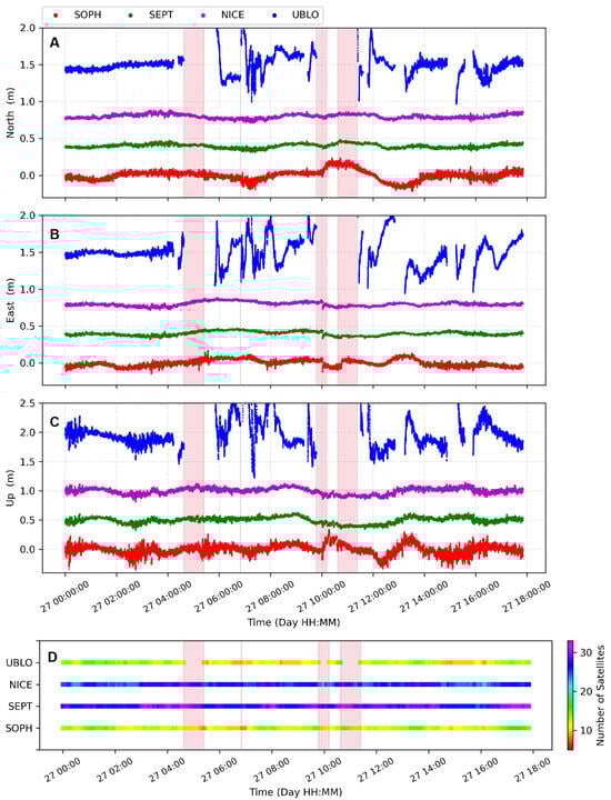 Kinematic displacements from the real-time analysis at the SOPH, SEPT, NICE, and UBLO stations for the North (A), East (B), and Vertical (C) components on 27 September 2023. (D) Number of available satellites tracked by geodetic receivers from GNSS observations at a 1-s sampling rate. For visualization purposes, displacements greater than 0.8 m in the UBLO solution are not shown in the comparison. Light pink vertical stripes depict gaps in the kinematic solution and the loss of satellite tracking capacities of the UBLO receiver.