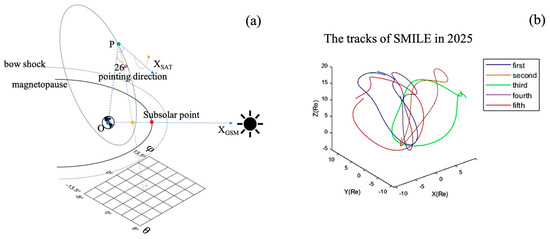 Simulation of detection attitude during MHD imaging in satellite operation and selection of the tracks. (a) shows that the direction of the orientation is always the line between the satellite position and the center of the earth rotated by 26° around XSAT in the positive. The principle of MHD imaging is to integrate the 3D emission along the line of sight [10]. (b) The shape of every selected track under the GSM coordinate system in Table 1 (figure adapted from Wang et al. [16]).