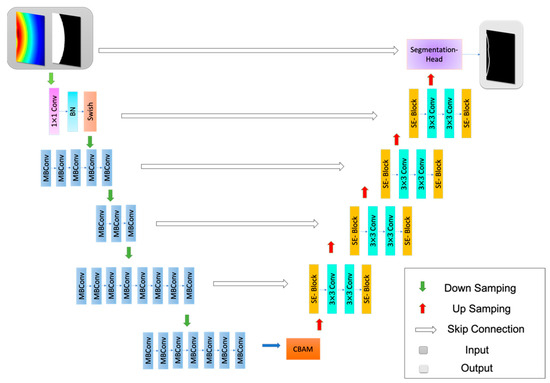 The overall architecture of the OESA-UNet is presented in Figure 6. We used the preprocessing image, SE block, CBAM, and efficientnet-b1 backbone to construct the model following the structure of the encoder and decoder. The OESA-UNet encoder uses the efficientnet backbone network to extract low-level semantic information. Nearest neighbor interpolation is applied to the first downsampling, and the convolutional operation is used at each downsampling after the first. The efficientnet-b1 backbone network can reduce the number of parameters for model training and improve training performance. After that, we inserted the CBAM module into the bottom feature to fuse the attention feature responses between the multi-dimensional channels and spaces. In the decoder structure, two SE blocks are put into each decoder layer. One is in the skip connection stage, and the other is before upsampling with the nearest interpolation. Two 3 3 convolutional layers are added between the two SE blocks. The segmentation head (Figure 5b) includes a 1 1 convolutional layer and batch normalization layer after the SE block. Sigmoid is the activation function. The inputs of the model are the preprocessed image and magnetosphere image. The features obtained by each encoder layer are connected to the corresponding decoder layer in a skipping manner, and we also connected depth features before the segmentation head and inputs.
