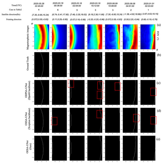 Segmentation results using the different models. (a) For each case of magnetospheric images, (b) represents the true position of the magnetopause in the magnetospheric image. (c–g) are the segmentation result under the corresponding models. The red boxes indicate segmentation errors between the model and (b).