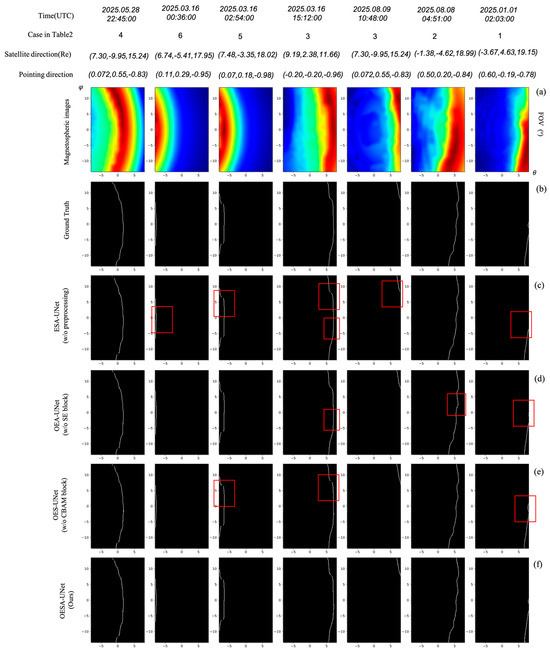 Qualitative comparison of ablation study. (a) For each case of magnetospheric images, (b) represents the true position of the magnetopause in the magnetospheric image. (c–f) are the segmentation result under the corresponding models. The red boxes indicate segmentation errors between the model and (b).