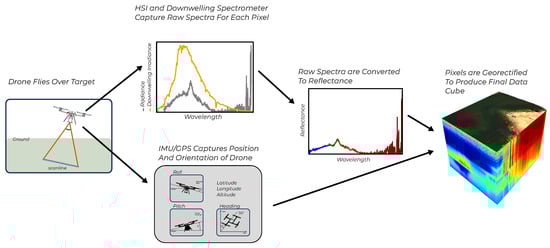 - Arroyo-Mora, J.P.; Kalacska, M.; Inamdar, D.; Soffer, R.; Lucanus, O.; Gorman, J.; Naprstek, T.; Schaaf, E.S.; Ifimov, G.; Elmer, K.; et al. Implementation of a UAV–hyperspectral pushbroom imager for ecological monitoring. Drones 2019, 3, 12. [Google Scholar] [CrossRef]