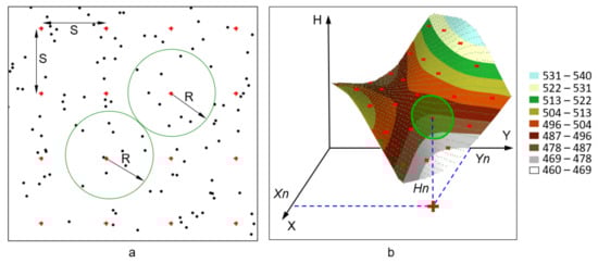 The generation of a GRID structure based on measurement points. S—the spacing between individual nodes; R—the radius of the searches for measurement points around the node; black points—measurement points; red crosses—GRID nodes; Xn, Yn, Hn—coordinates of the GRID node. The legend provides the height values in metres. (a) node determination parameters; and (b) the interpolation principle. Source: own elaboration.