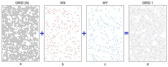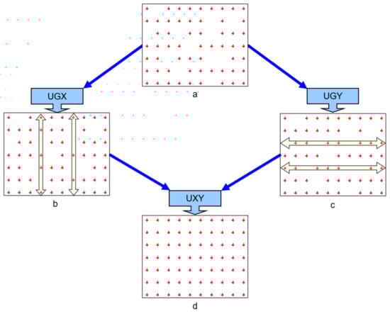 The application of the iterative method makes use of the processing for the sequence of three working modules: [UGX], [UGY], and [UXY] (Figure 2). The set with an incomplete GRID structure is used as the source data (Figure 2a). At the first stage, the [UGX] and [UGY] modules, while operating independently, generate the missing nodes in columns (the X axis direction—[UGX]) (Figure 2b) and in rows (the Y axis direction—[UGY]) (Figure 2c) of an incomplete GRID structure. At the final stage of the process, the [UXY] module merges the structures generated by the [UGX] and [UGY] modules to create a complemented (here: complete) GRID structure (Figure 2d).