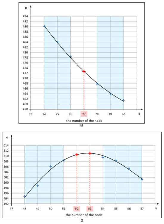 Figure 3 presents two cases of determining values at the nodes for differently defined processing parameters. The X axis is supported by the [UGX] module, while the Y axis is supported by the [UGY] module. Successive sorted nodes are located along the horizontal graph X axis, while the heights H determined at them are presented on the vertical axis. In the first case (Figure 3a), all the nodes are located in a single column of the GRID structure along the X axis. The data search space for determining the polynomial coefficients (marked in blue colour) was defined in the form of three nodes (numbers 24, 25, 26) before and three nodes (numbers: 28, 29, 30) behind the missing node with number 27 being determined. However, the acceptable distance between the extreme nodes and the node being determined (the number of the missing nodes) was set as one. The value at the node is determined by the calculation, for x, of the polynomial value as a solution of the system of equations: a polynomial of a certain degree and a straight line passing through a node with a known x coordinate.