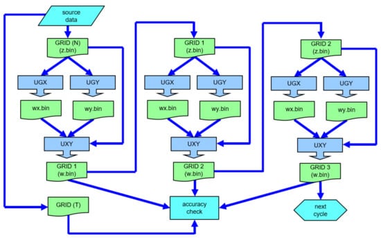 A graph showing the transfer of data in the iterative process is provided in Figure 5. In the first phase of implementation, both modules ([UGX] and [UGY]) are used, which, thanks to the possibility of parallel processing, can run simultaneously in this stage. In both cases, it is the incomplete grid of nodes (GRID (N)) that is used as the source data. The datasets used in the processing process were designated as source sets [z.bin] and resulting sets [w.bin] (Figure 5). The [UGX] and [UGY] modules, operating independently, each time generate the missing nodes in the GRID structure stored in the source file [z.bin]. In each iteration of the processing process, independent resulting files with the missing nodes are created: [wx.bin]—for the GRID columns and [wy.bin]—for the GRID rows. Each time, they can be generated for other criteria defined individually for each iteration.